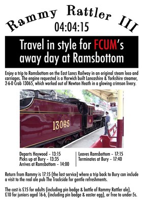 How would you like to travel in style for FC United’s away game at Ramsbottom on Saturday 4 April 2015? Well, now you can, because we’ve only gone and booked a steam locomotive to take FC fans to the game.
