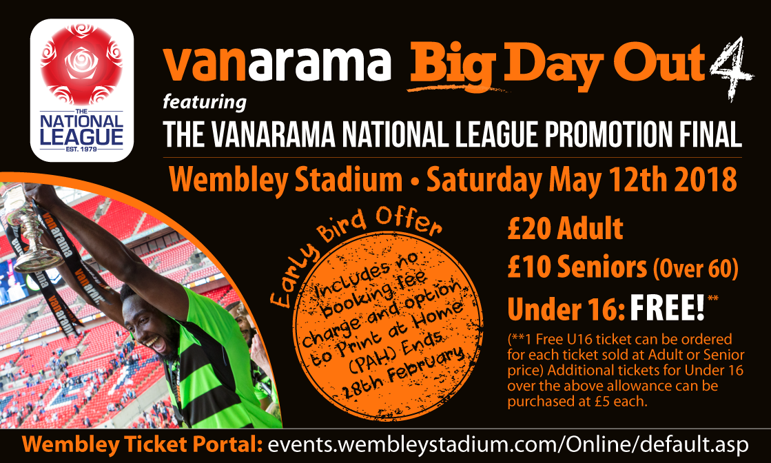 The Vanarama National League has released details of the opportunity for ALL football fans to purchase Early Bird tickets for their Promotion Final on Saturday 12th May 2018 at Wembley Stadium connected by EE.
