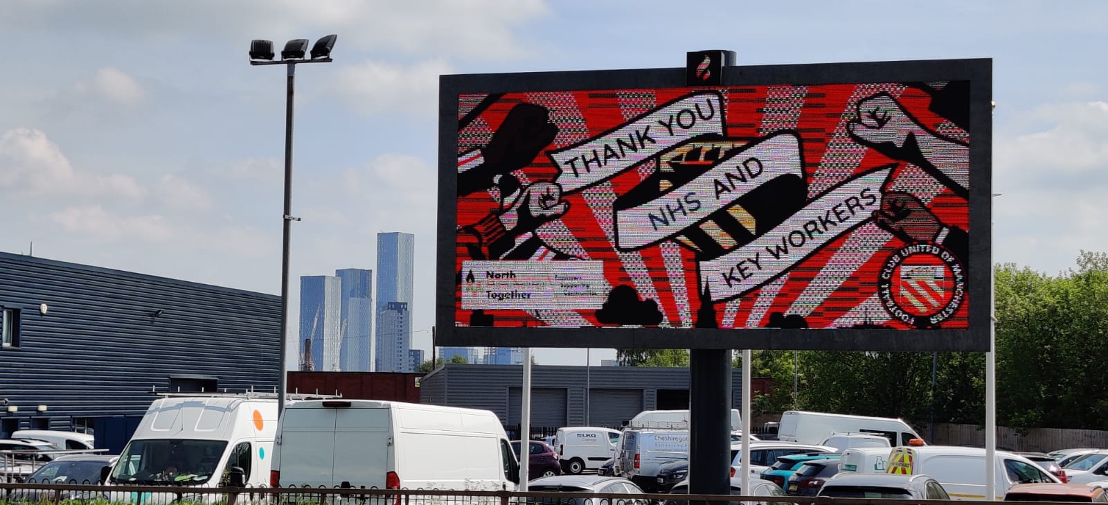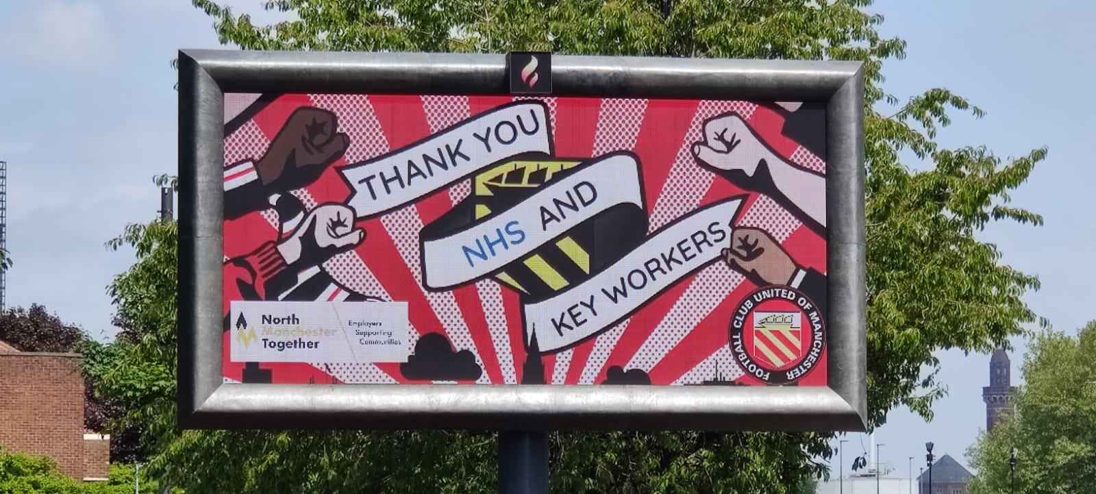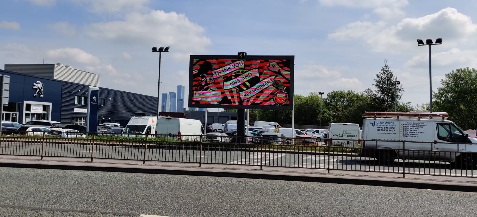 Following the publicity courtesy of our collaboration with the North Manchester Business Network and the feature on Granada reports, we were offered two spaces on electronic billboard in Salford, and we wanted to use them to pay tribute to the NHS and ALL key workers who are collectively getting us all through the pandemic, at great personal risk.