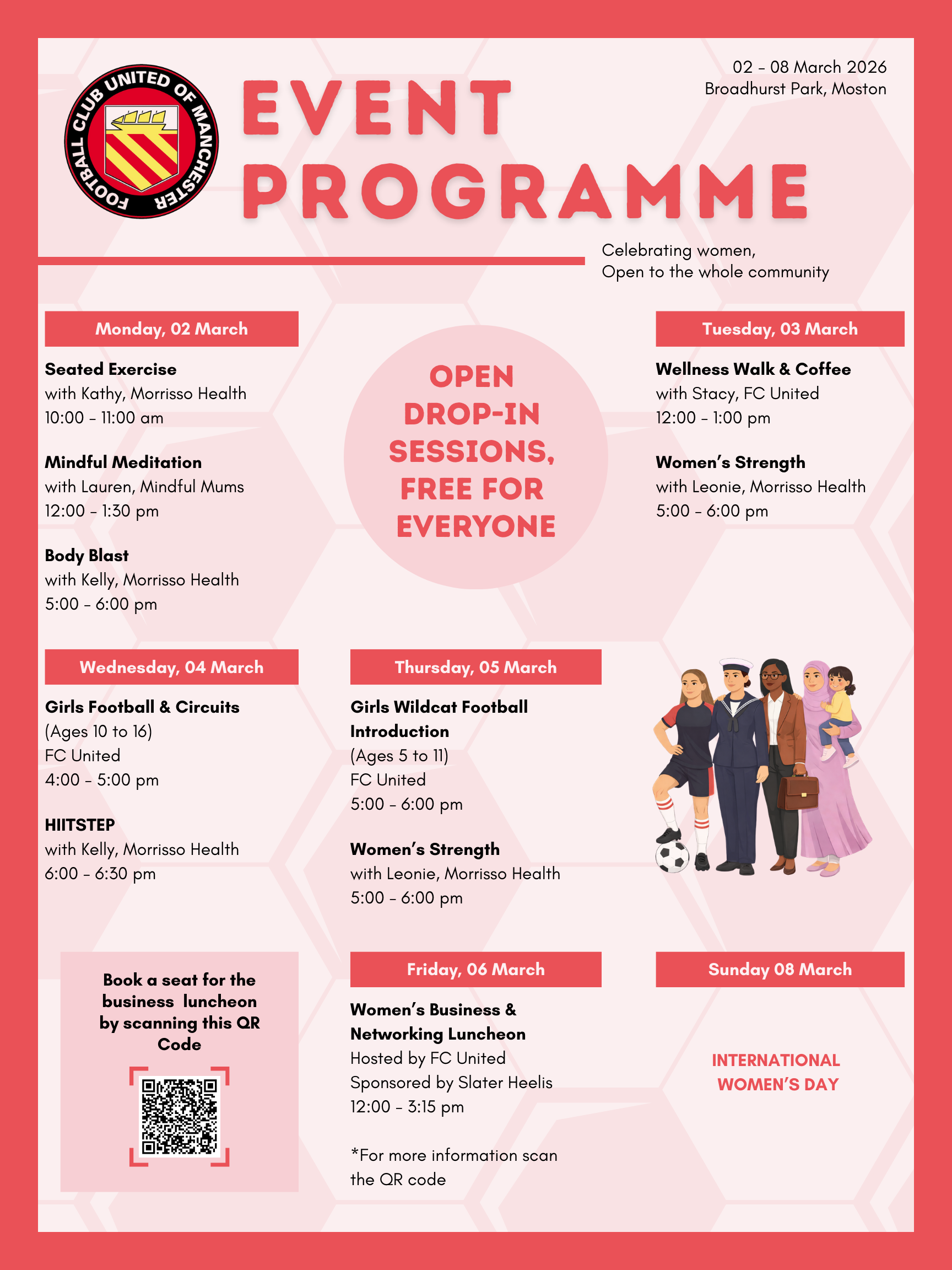 “International Women’s Day is an important opportunity to celebrate the amazing women in our community. This week of activities has been designed to bring people together, offer new experiences, and create a space where everyone feels welcome. Whether you’re joining us for fitness, football, or simply to connect with others, there’s a place for you here.”