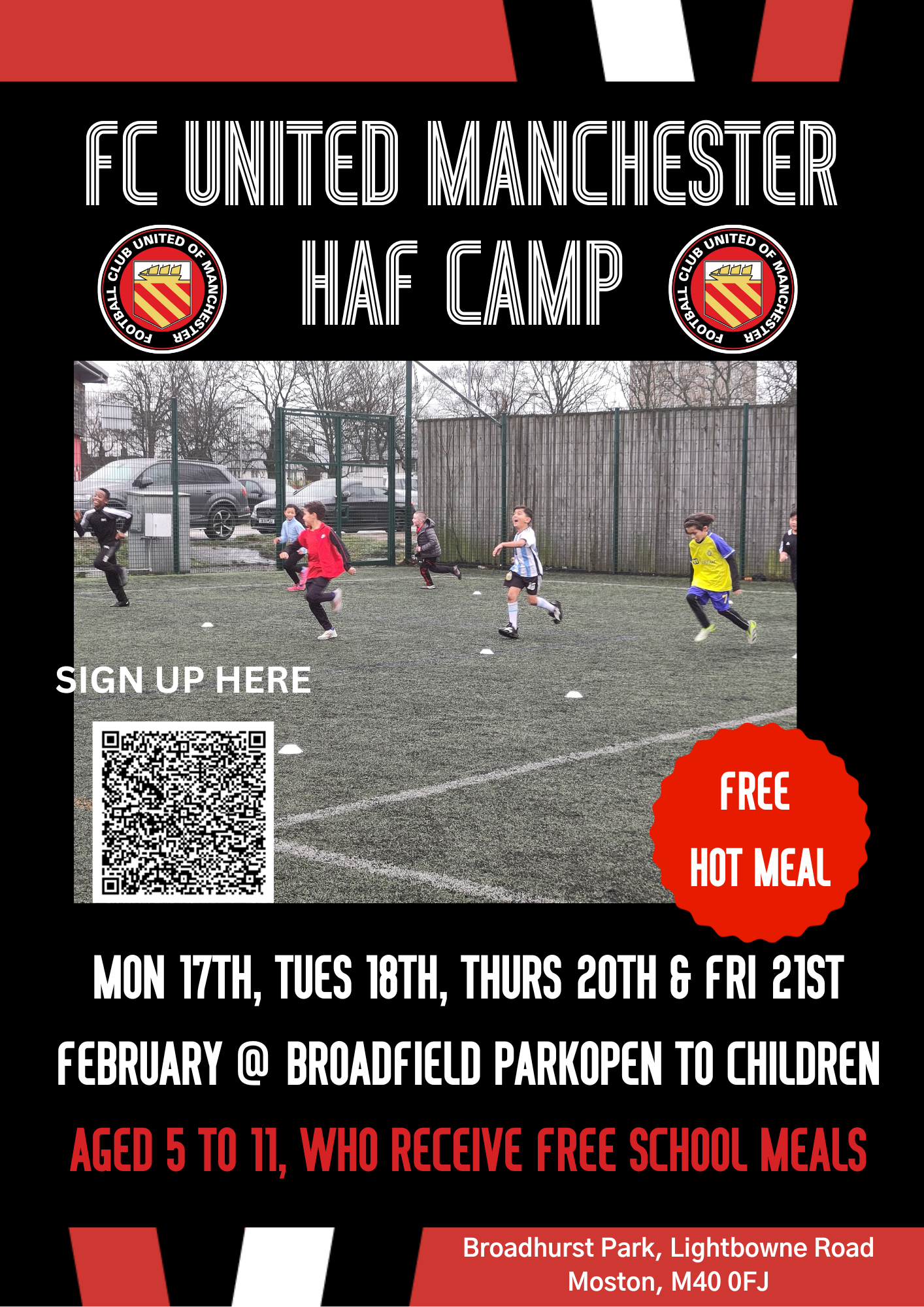 Sign them up for the FC United Manchester Half Term Camp! Perfect for young footballers of all abilities, our camp offers top-quality coaching, skill-building sessions, and plenty of match action in a fun and supportive environment. Don’t miss out—spaces are limited, so book now to secure your child’s place! All places to be booked via the Manchester Active link below or in the QR code, aimed at children who are on FREE school meals.
