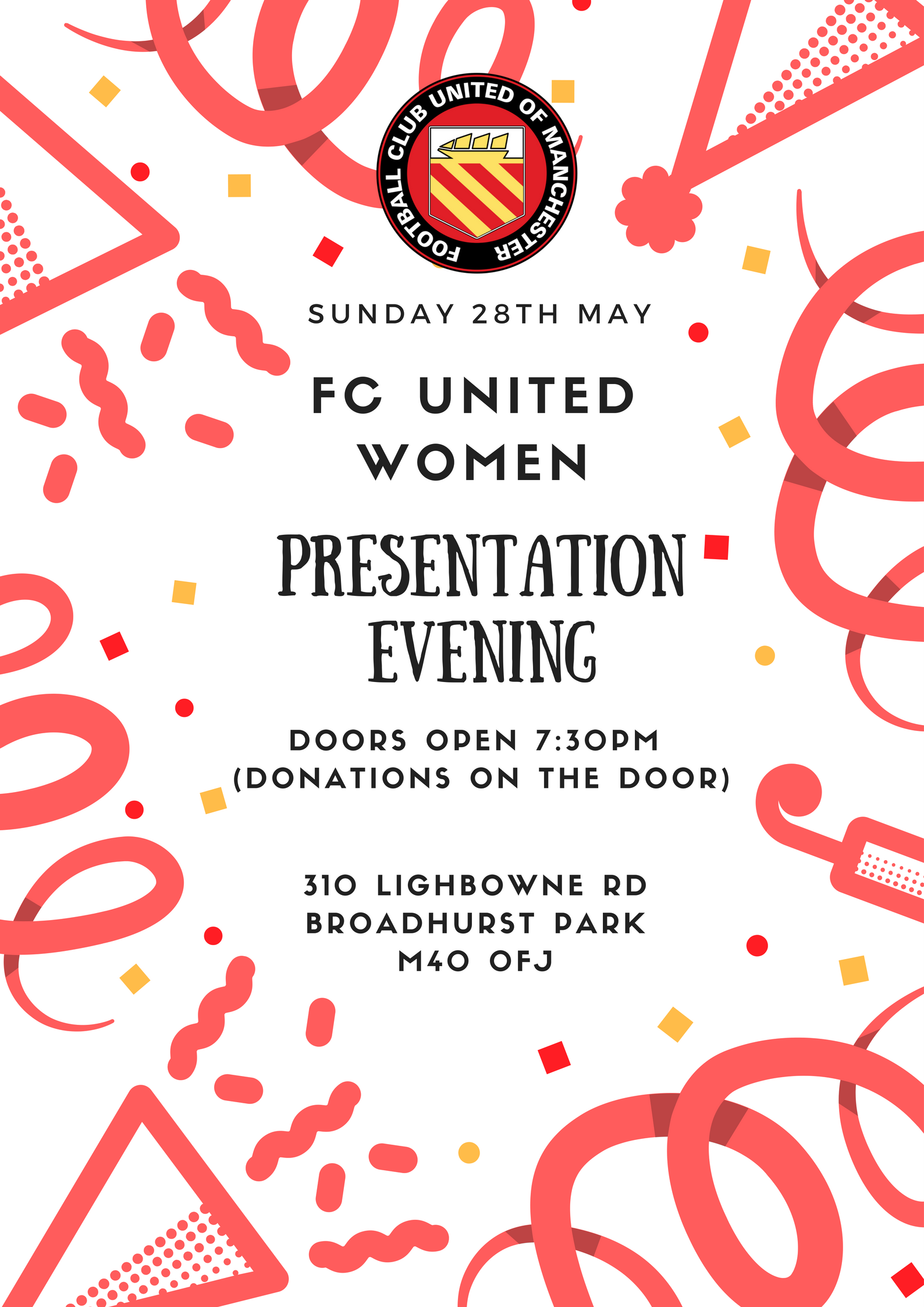 Come and celebrate their outstanding season with the FC United Women this Sunday 28th May. Doors open at 7:30pm. There will be food on for the night along with the award ceremony which sees several coveted awards being presented to the women’s team players after their historic season. The bar is open till late with music and it is set to be a great night.