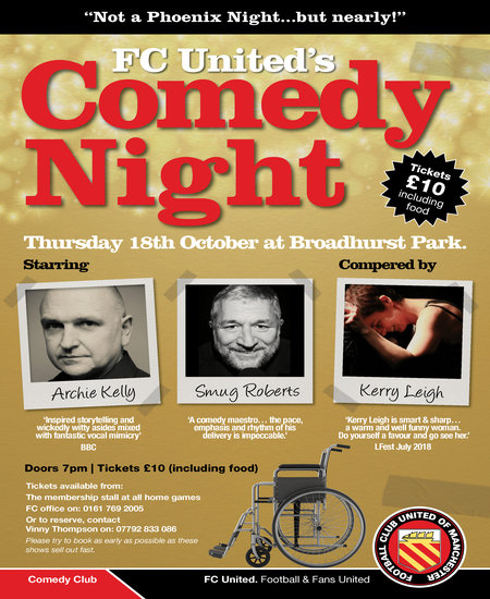 FC United is pleased to announce that the club will be hosting a Comedy Night at Broadhurst Park on Thursday 18th October.
