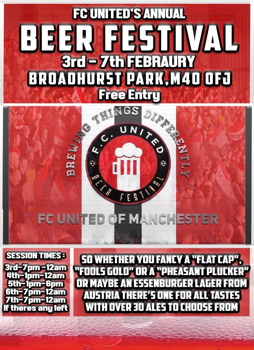 Meanwhile, FC United’s Beer Festival runs from Friday to Tuesday, offering more than 20 ales and ciders from local breweries, to Essenburger Austrian lager in honour of the visitors.