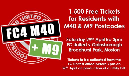 As part of the FC United’s commitment to the local community , we are delighted to announce that our final home game of the season against Gainsborough Trinity on Saturday 29th April ko 3pm will be dedicated as our FC4M40 (+M9) day, where 1,500 free tickets will be available for residents living in a M40 and M9 postcodes, local schools and community groups.