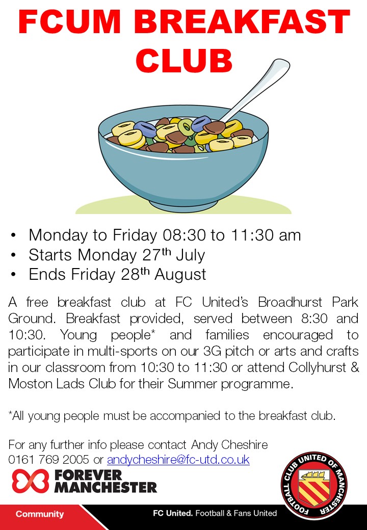 FC United are running a free Breakfast Club at Broadhurst Park. Breakfast is provided, which will be served between 8:30 and 10:30. Young people and families are encouraged to participate in multi-sports on our 3G pitch or arts and crafts in our classroom from 10:30 to 11:30. You can also attend Collyhurst & Moston Lads Club for their Summer programme.