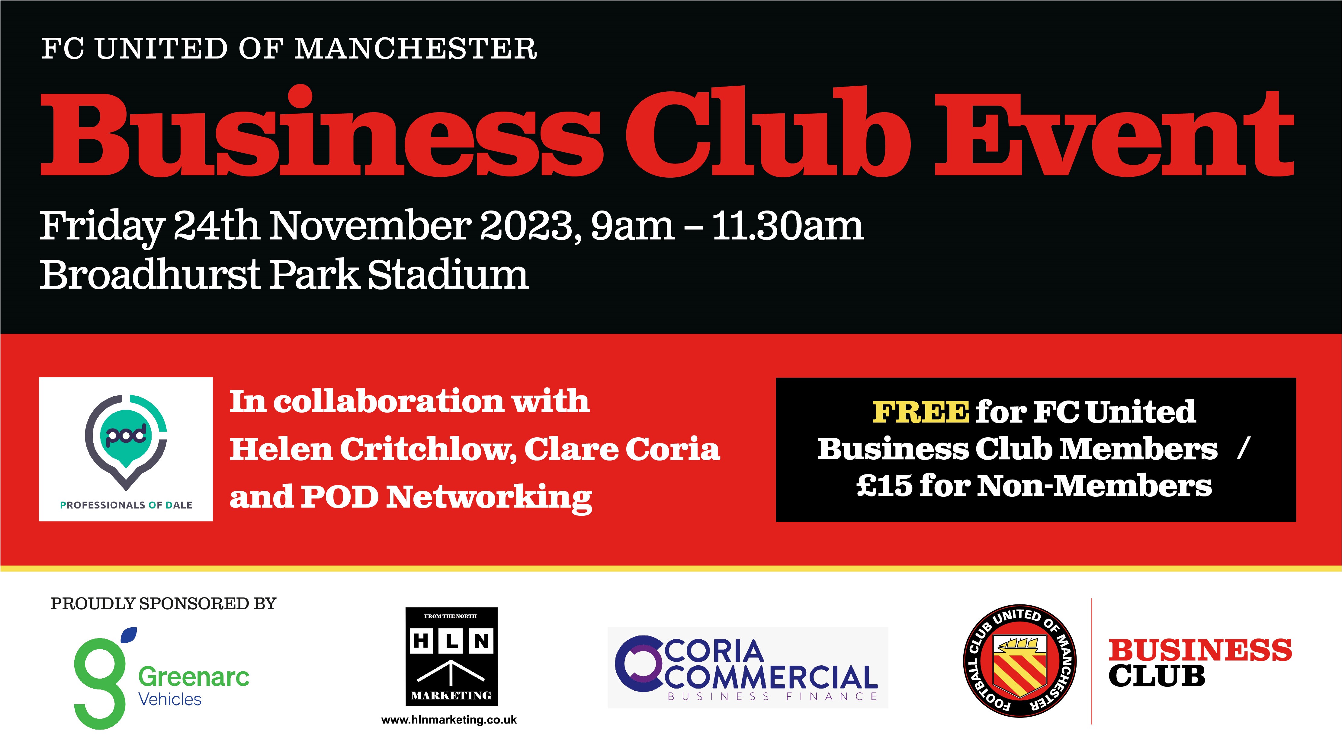 FC United are pleased to invite you to join us at our 2nd Business Networking Event of the 23/24 season on Friday 24th November. Our Breakfast Event will be held at Broadhurst Park in our function room, over-looking the pitch. Refreshments will be provided.