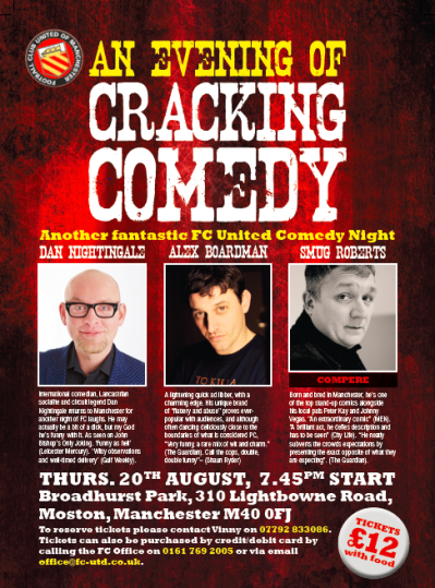 Comedy returns on Thursday 20 August 2015 with the first FC United comedy night of the season and the first fundraising night at Broadhurst Park. Compere and opening act is Smug Roberts of