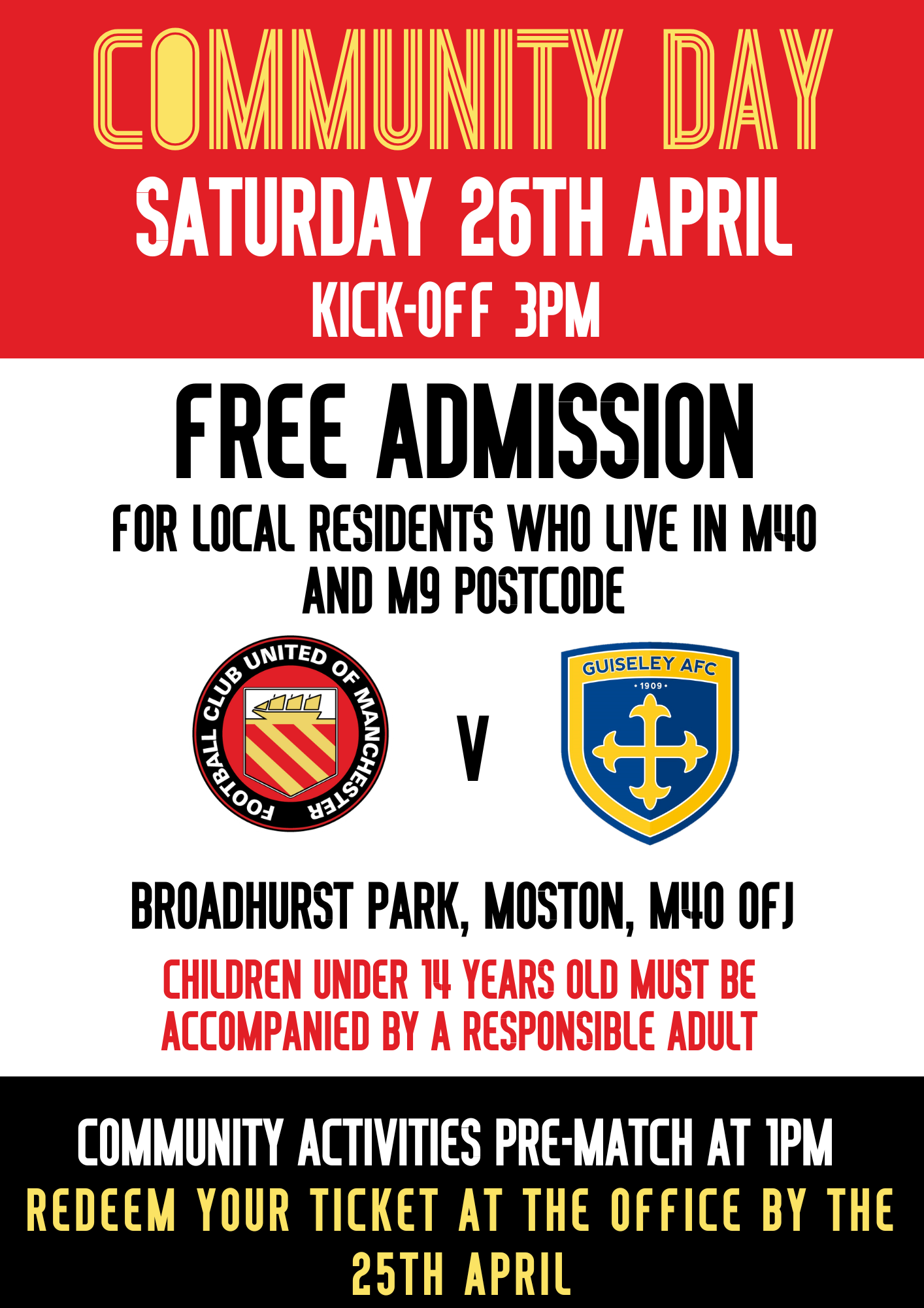 Our final Men's Team game of the season will take place on Saturday 26th April when we welcome Guiseley to Broadhurst Park. We're delighted to announce the match will be our annual Community Day with lots of fantastic activities taking place around the ground and plenty of free tickets on offer for local residents!