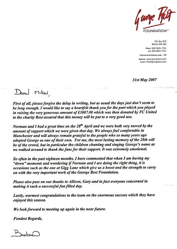The following letter has been received from Babara McNarry, sister of George Best, following her visit to Gigg Lane for the final home game of the 2006/2007 season.