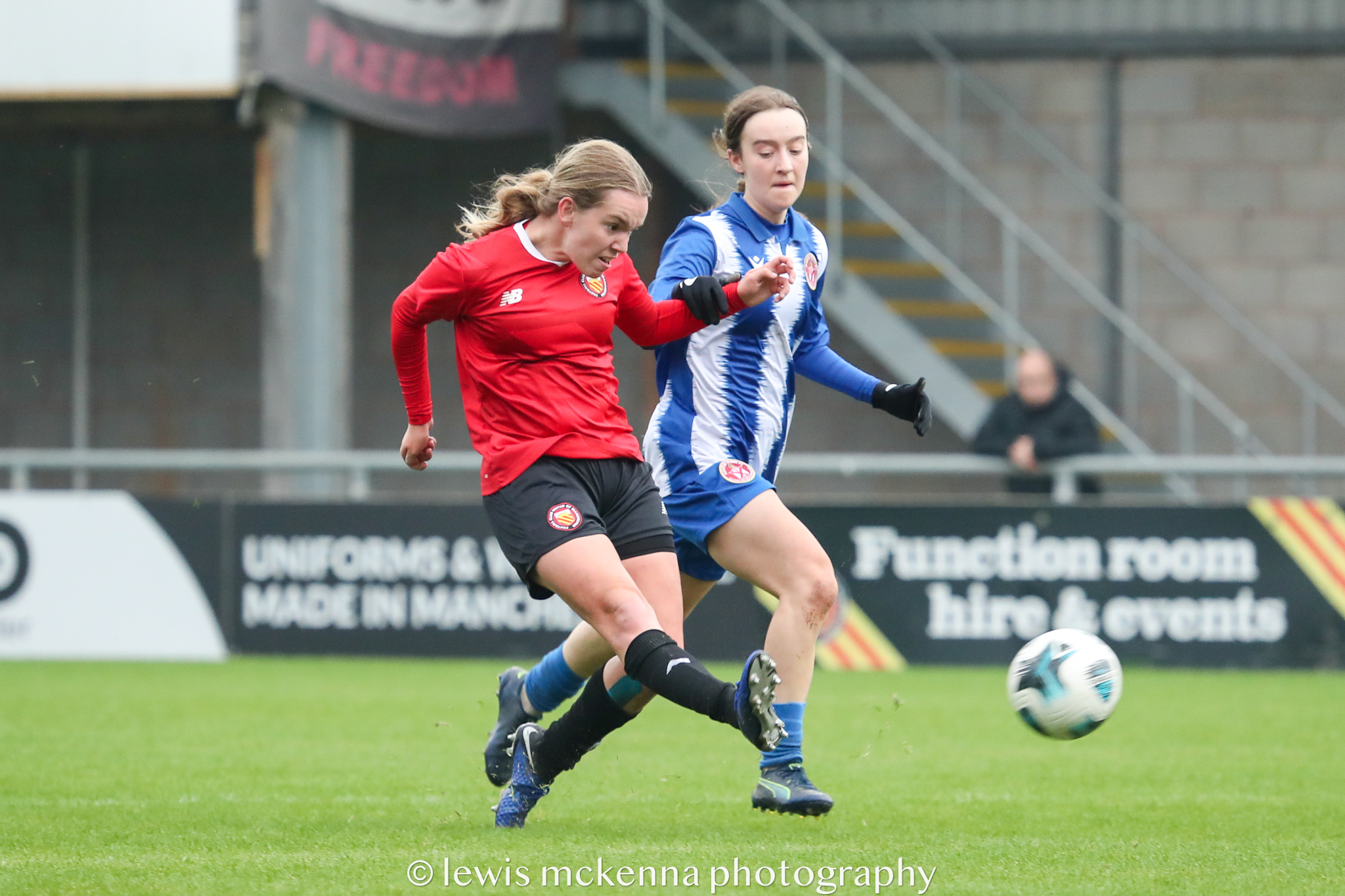 From there FCUMW had a few attacking opportunities, but they were not capitalised on with a cross from Naomi Lawrence that no one was able to receive on time and a shot from Mia Hayes that was caught by the keeper. Another promising attempt on goal resulted in nothing as Mia Hayes was flagged offside. Ashton Town’s O’Neil looked set to bag a second goal after a big mistake let her through on goal. Sophie Donald successfully made the save and even more fortuitously, the flag was up for offside anyhow but Ashton were certainly looking the more dangerous of the sides at that point.