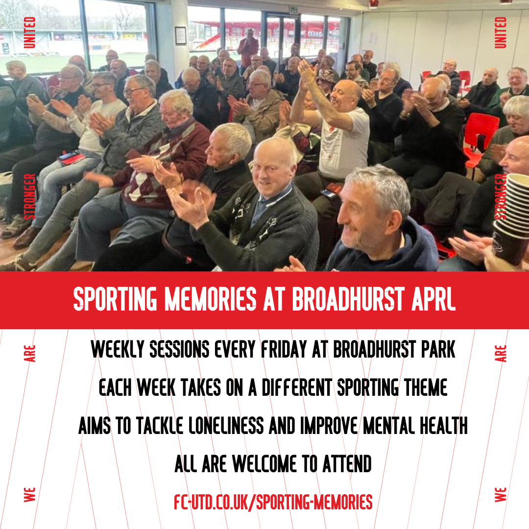 Our Sporting Memories sessions take place in the function room at Broadhurst Park every Friday, 1:30pm – 3pm. All are welcome to attend with admission being £1 and refreshments provided. More information on the weekly sessions here.