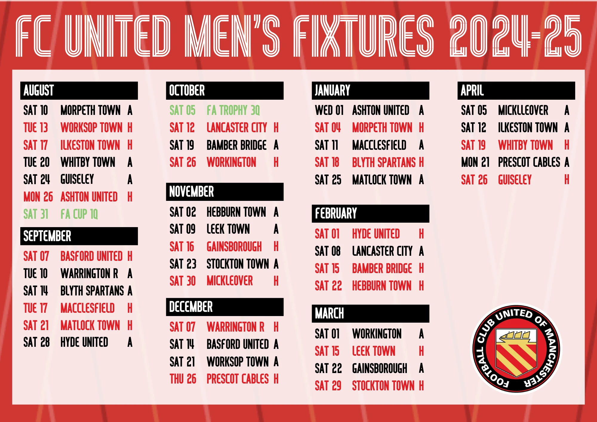 FC United of Manchester is thrilled to announce the release of our Northern Premier League fixtures for the upcoming season! The new schedule promises an exciting line-up of matches, including several teams who will be visiting Broadhurst Park for the first time. On the road we have a number of new grounds to travel to, for what has the potential to be an exciting and memorable 20th campaign.