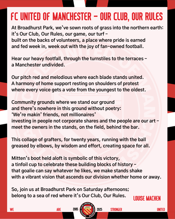 We think Louise's words capture perfectly what makes FC United what it is, on and off the pitch, and we are honoured that someone of Louise's stature and reputation has taken the time to write such a remarkable piece.