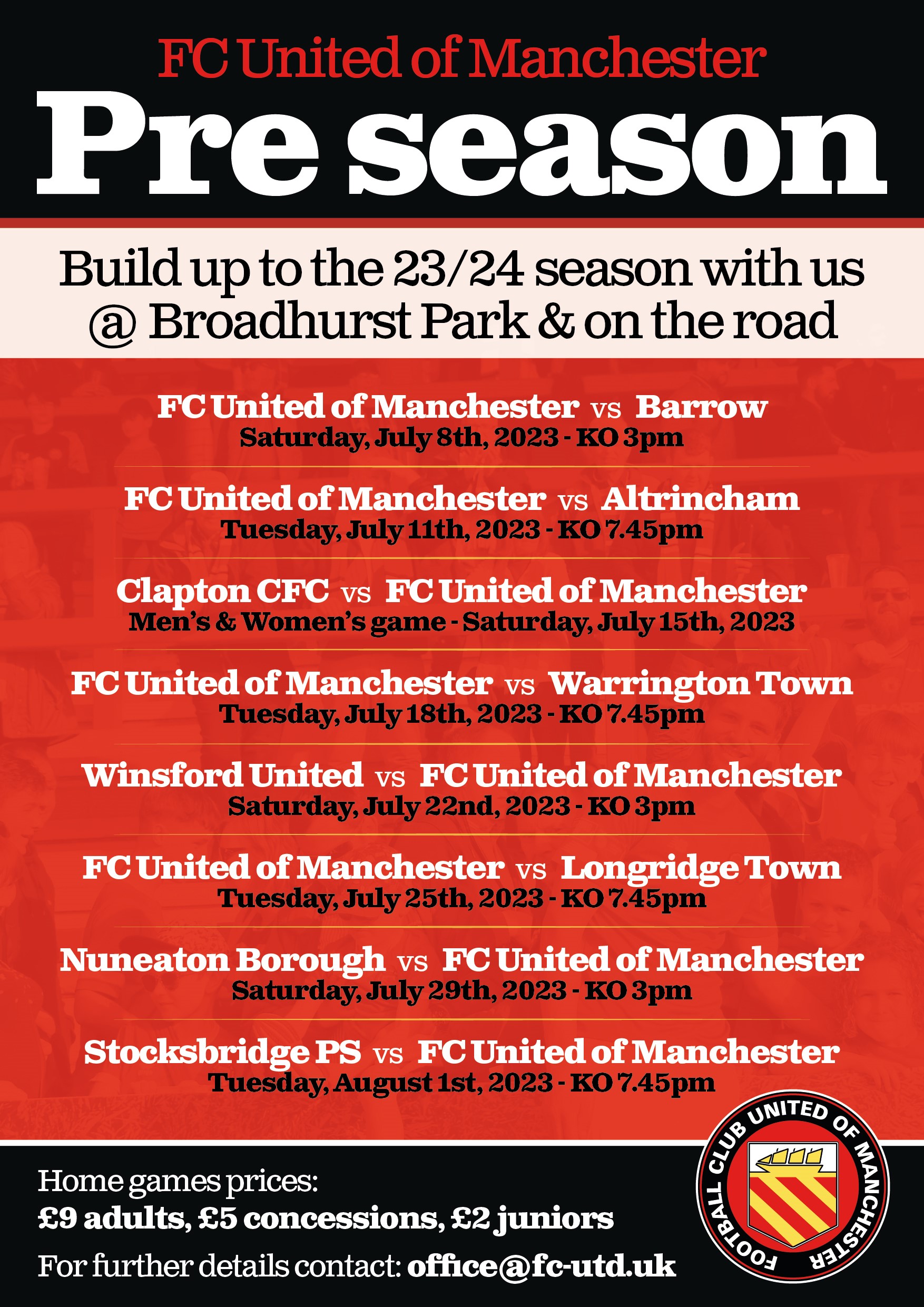 FC United can today reveal our 2023/24 pre-season fixtures. 8 teams will face the Reds, including the return to Broadhurst Park of a certain prolific goalscorer.