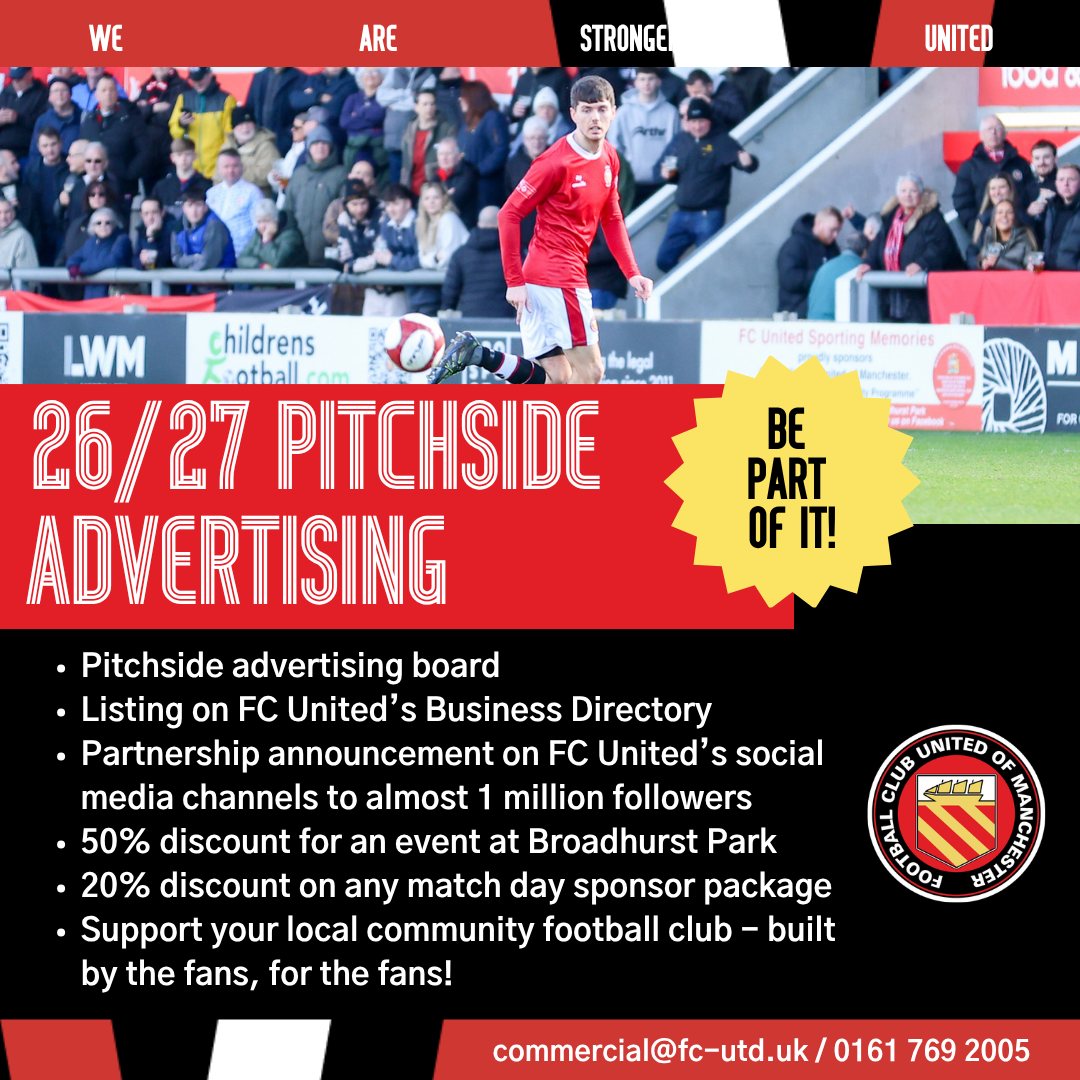 FC United of Manchester is inviting local businesses and organisations to promote their brand with pitchside advertising boards at Broadhurst Park.