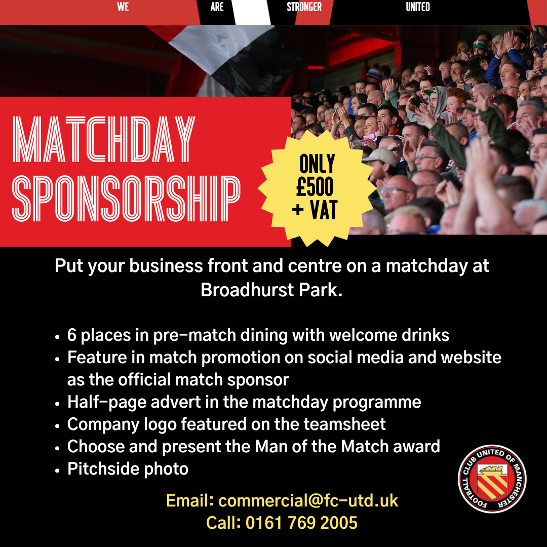 Match Sponsorship places are limited— so if you're interested in supporting FC United this season, don’t miss your chance to get involved.