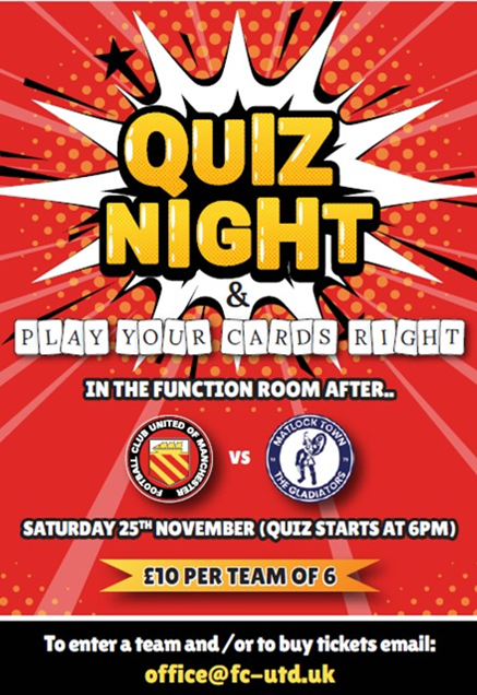 We now have a very exciting addition to the day as we are hosting an FC United Quiz Night, presented by Sporting Memories. The night will incorporate Play Your Cards Right and will start at 6.00pm in the main bar. Teams will comprise of 5 members and will have a first team player allocated to each team by random draw.