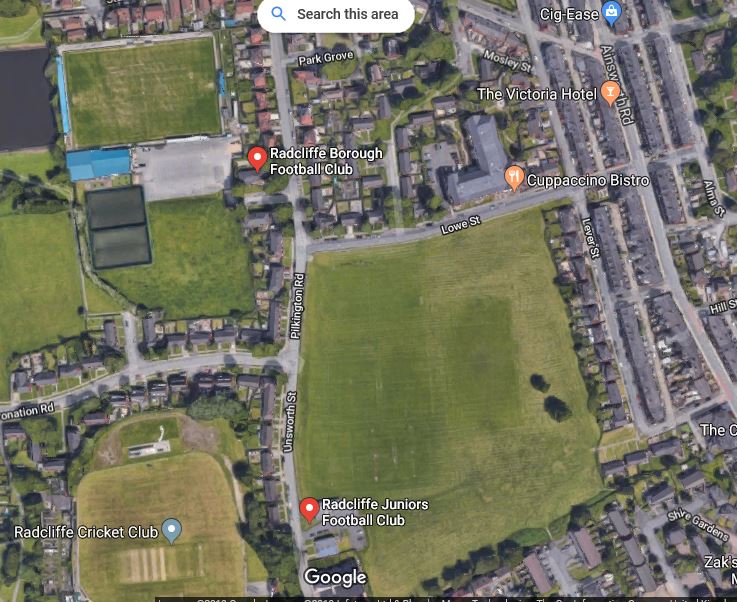 On the map this is the field where at the bottom it says Radcliffe Juniors with Lowe Street, Pilkington Road and Unsworth Street surrounding it.