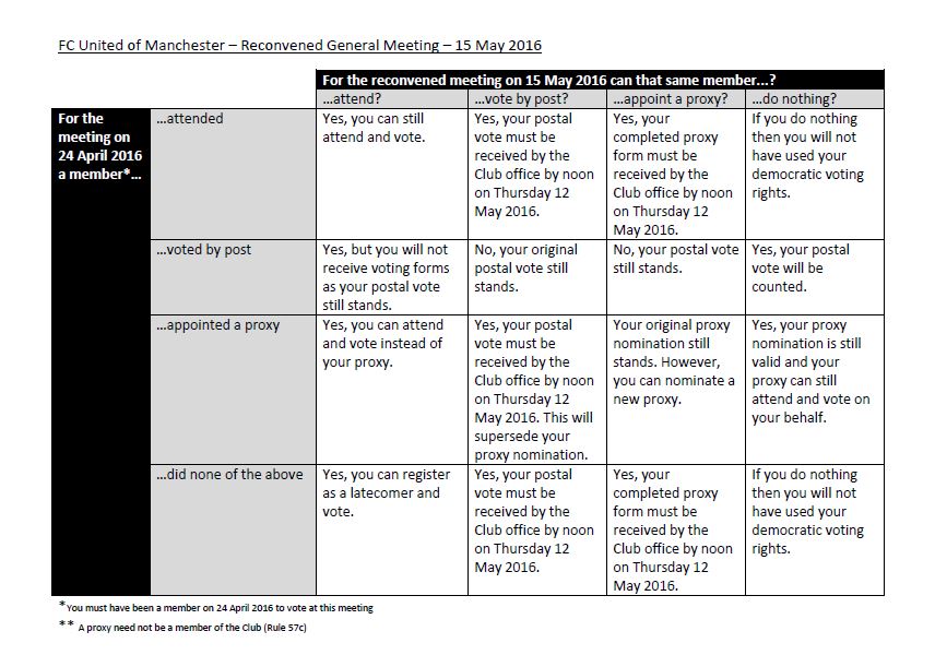The following table aims to clarify the position for members whether attending in person, voting by post or voting via a proxy: