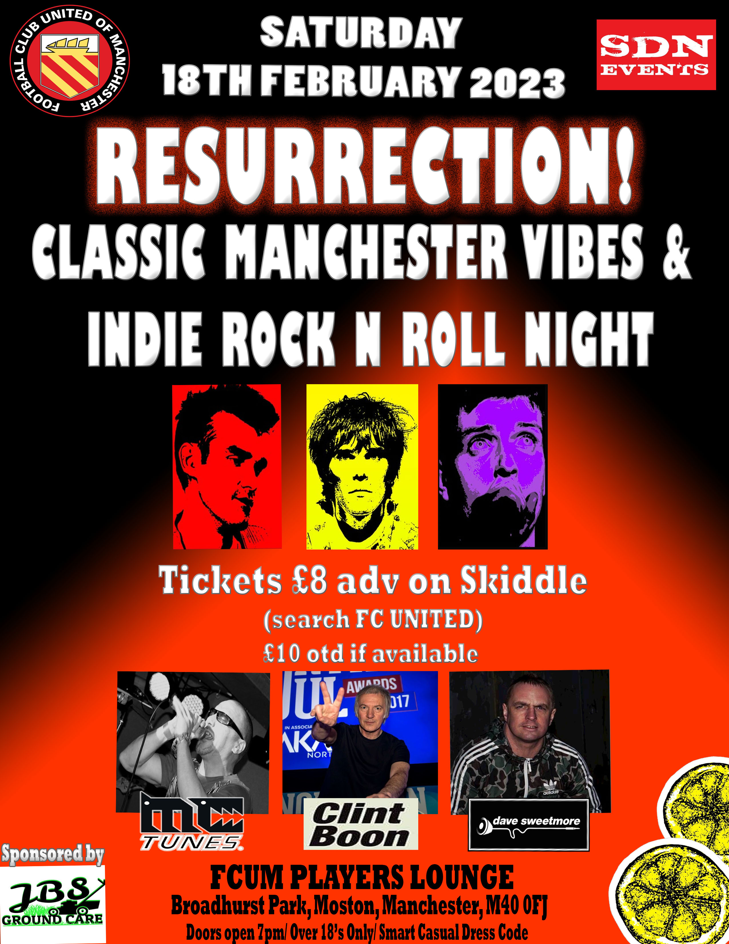 The event, named 'Resurrection', is to be held in the upstairs Function Room at Broadhurst Park Stadium, and will take place on Saturday 18th February 2023. Appearing live will be iconic DJ's Clint Boon, MC Tunes, and Dave Sweetmore.