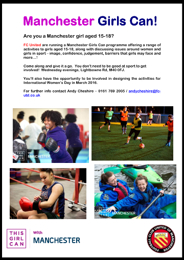 FC United is running a ‘This Girl Can’ project for girls aged 15-18 each Wednesday evening from 6.30pm - 8.30pm. This Girl Can is a national campaign developed by Sport England and a wide range of partnership organisations that celebrates and promotes women in sport.