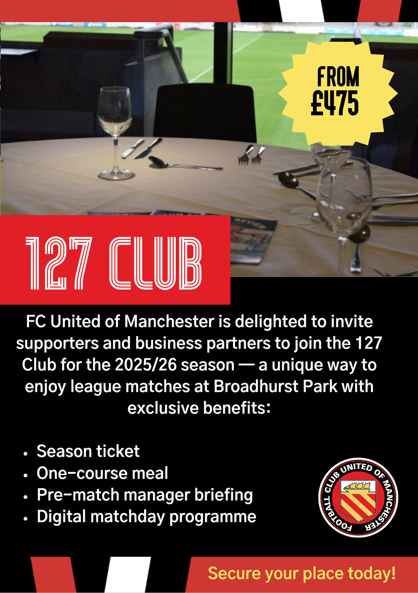 FC United of Manchester is delighted to invite supporters and business partners to join the 127 Club for the 2025/26 season — a unique way to enjoy league matches at Broadhurst Park.