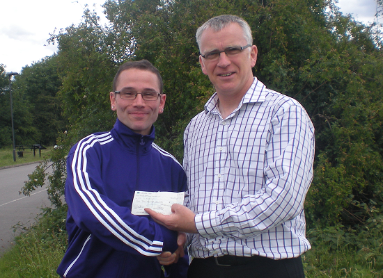 Dave Keelan accepting his £1,000 cheque from Andy Walsh.