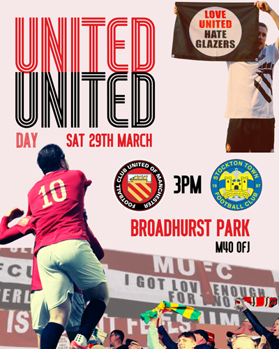 We invite all Reds to join us in a show of solidarity of supporters against the Glazers at our fixture against Stockton Town at Broadhurst Park on Saturday 29th March.
