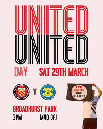 On Saturday 29th March, FC United of Manchester invites all United supporters to Broadhurst Park for United United Day, where we will come together in solidarity as we face Stockton Town. Together, we will make our voices heard: enough is enough.