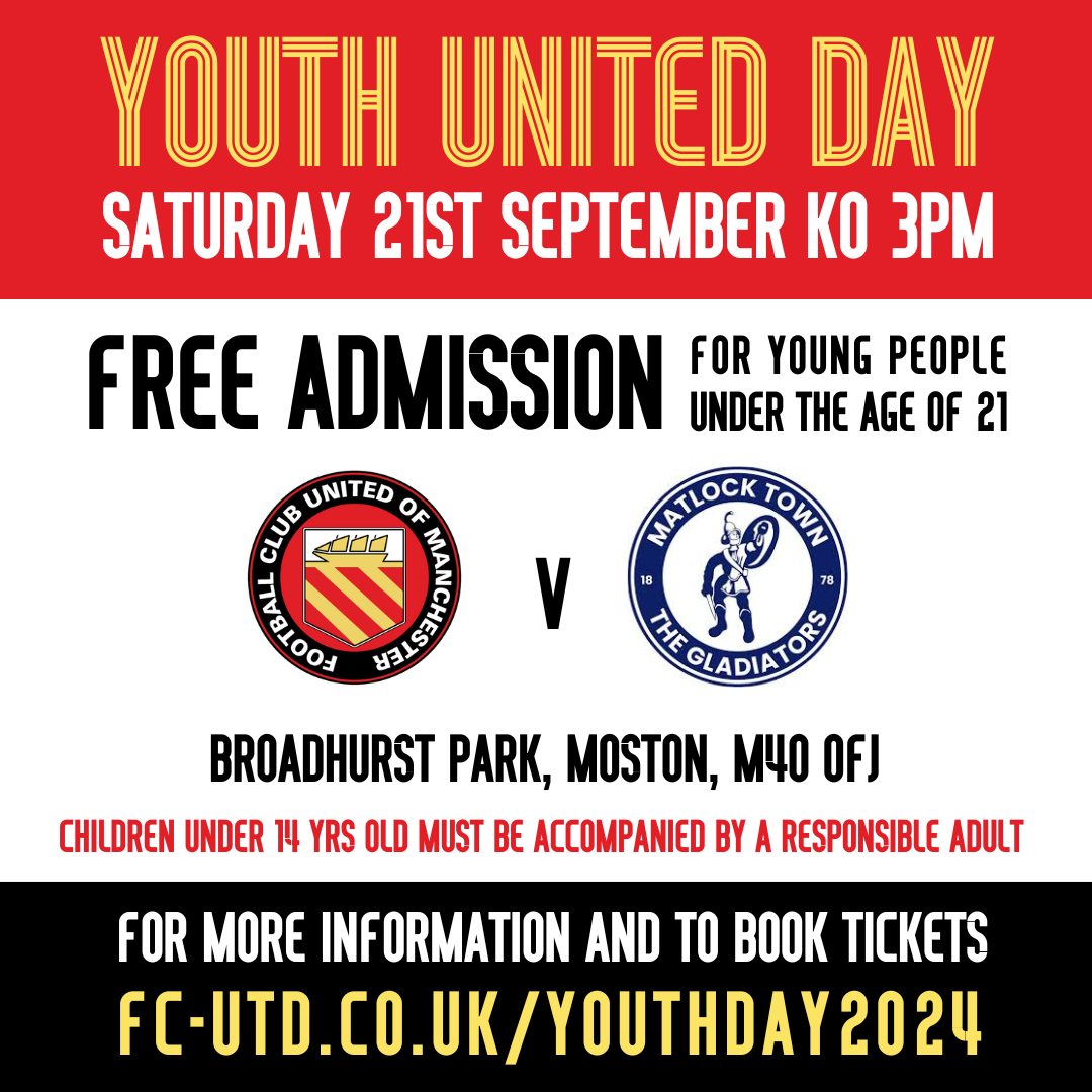 On Saturday 21st September, when FC United play Matlock Town in the Northern Premier League, the club will host Youth United Day. Free Entry for Young People Under the age 21.