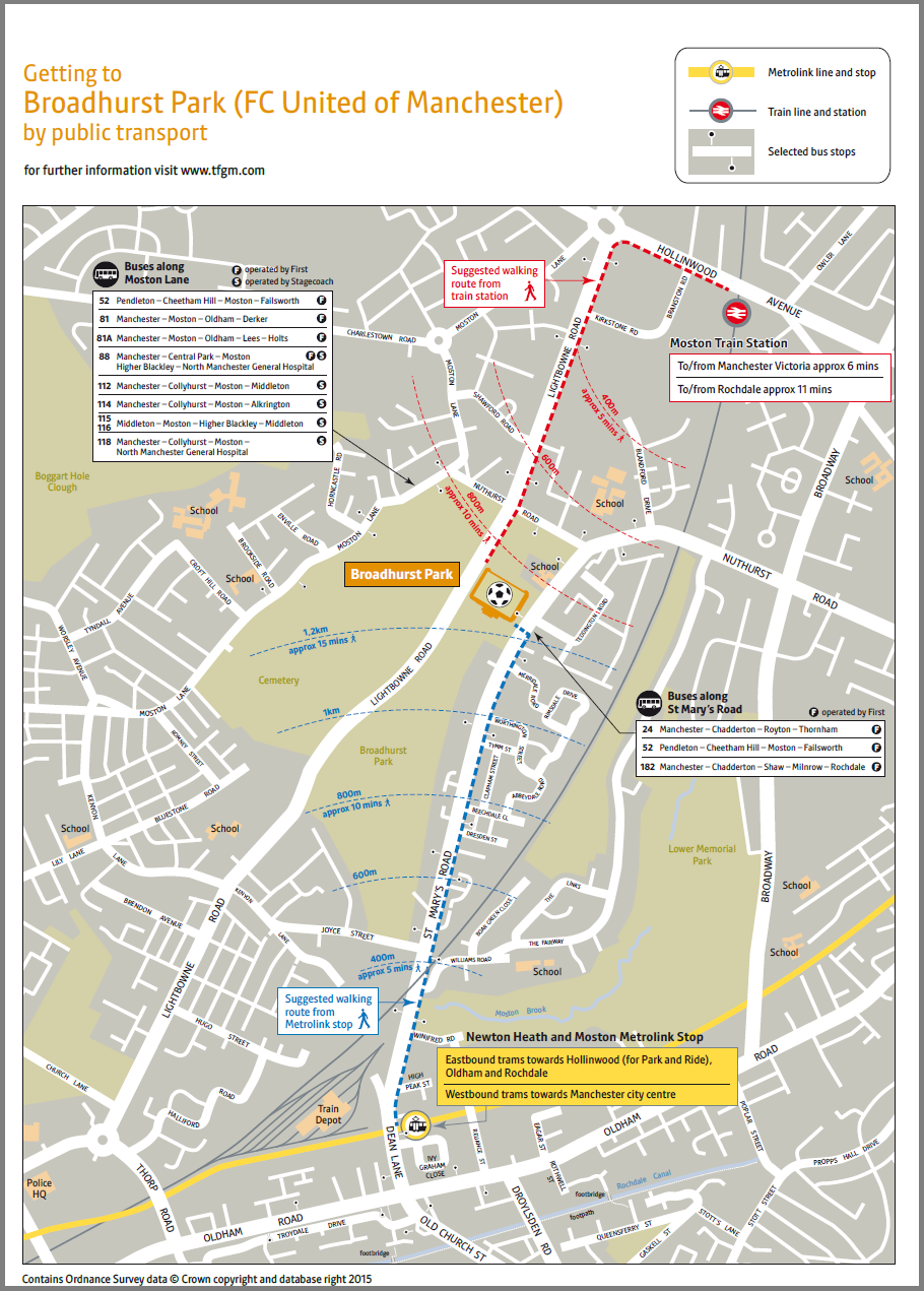 Welcome to the Broadhurst Park Travel Hub, helping FC United and visiting fans plan and make their way to Broadhurst Park efficiently, responsibly and economically. FC United encourages all football fans to make the most of public transport whether it's for all or part of your journey. You can access the public transport Journey Planner to plan your journey. The icons below give specific details for match day travel.